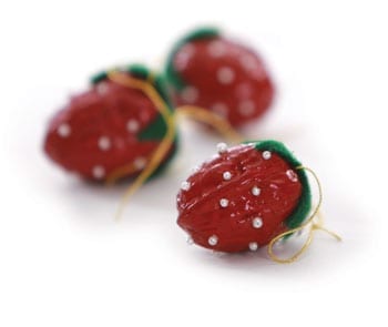 Paint each walnut with the red paint; let dry. Glue the beads all over the surface of each painted walnut. Parents should first demonstrate how to carefully use a straight pin to pick up one bead, dip in a dab of glue, then place it on the nut. Cover each nut with about 20 or so beads, spaced apart. Cut gold thread into individual pieces (about 4-5 inches long). You need one for each “strawberry” you’re making. Tie each thread piece into a loop. Cut small “star” shapes out of the green felt, one for each ornament; the shapes don’t need to be perfect. These will form the “leaf” atop each nut. Place gold thread loop under each felt piece atop each “strawberry” and glue together so that you have a loop for hanging on tree. (Gold thread is glued in between the painted nut and the felt “leaf.”)