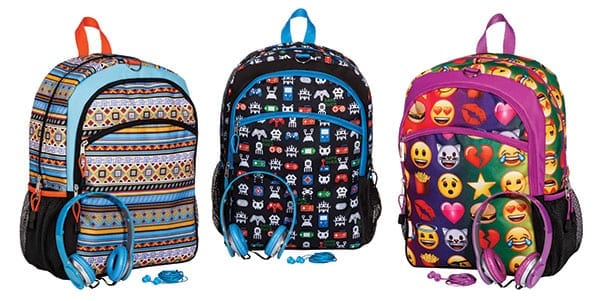 Assorted headphone backpacks: Headphones and earbuds are included with these graphic backpacks. The colorful patterns are sure to make your child stand out from the crowd. Available at Target $29.99.