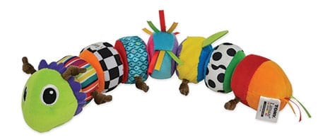 Lamaze Mix and Match Caterpillar. Smooth and crinkly textures to encourage touching, and cause and effect play. The Velcro pieces come apart for color matching, and it has chimes and rattles inside for sound. Available at diapers.com for $20.99