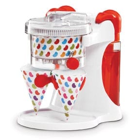 This ice shaver can make two snow cones at a time. The flavors available for purchase may remind you of favorite jellybeans such as wild cherry, green apple and root beer. Some flavors are even available in sugar-free versions.