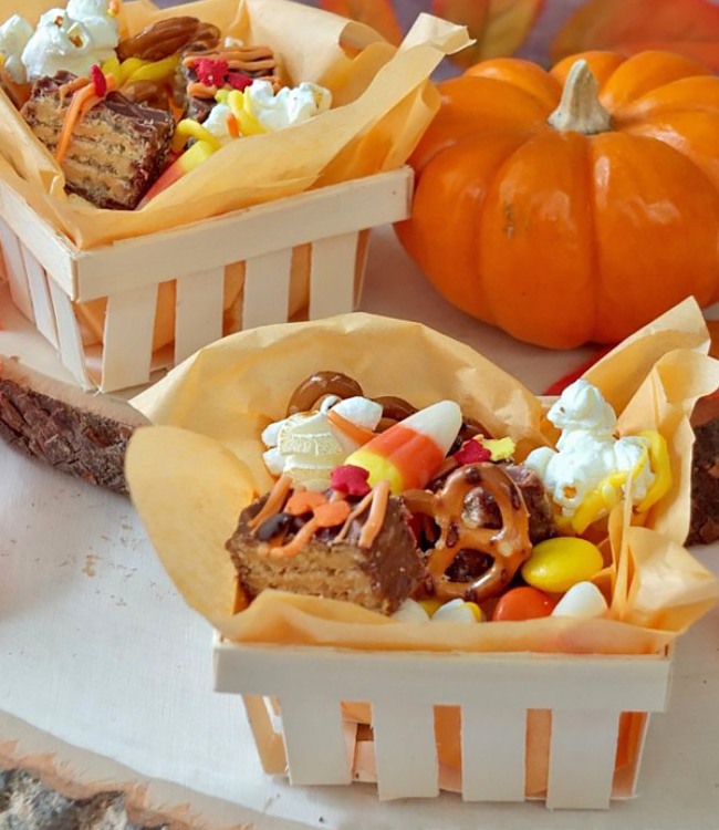 Whip up this fall-colored mix by combining chopped wafer bars, candy corn, popcorn, mini pretzels and candy coated chocolates. Drizzle with yellow and orange candy melts and serve in paper cups. Find directions at littledebbie.com.