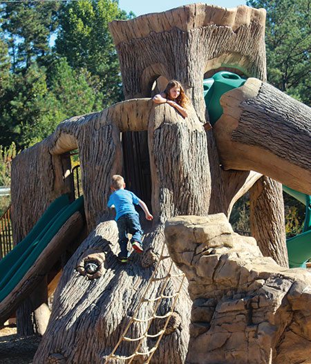 Features: The playground layout is well designed and adorable, with a whimsical treehouse theme. I can easily keep my eyes on everyone, while they each take interest in a variety of age-appropriate activities. I stroller-walk with my little one, while my 4-year-old enjoys the play area. My older kids could spend hours in the giant climbing web or biking on the nearby Silver Comet Trail. As if that wasn’t enough, the park has two covered pavilions, one with picnic tables, perfect for a lunch playdate or birthday party! The second pavilion features a fitness area with exercise equipment – great for workouts while older kids play.